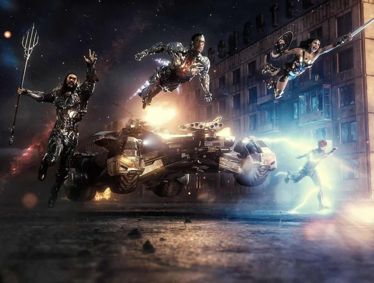 Киборг, Бэтмен и Бэтмобиль, Аквамен, Чудо-женщина и Флэш — движутся вперед, как один, к судьбе.