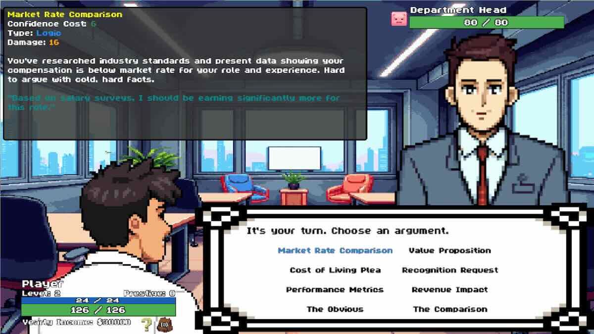 Поклонникам Pokémon понравится необычный подход к пошаговому жанру в этой игре. Пробиваясь по карьерной лестнице, вам нужно будет побеждать своих боссов, используя логику, данные и сарказм. Победа над всеми менеджерами принесет вам прибавку к зарплате.
